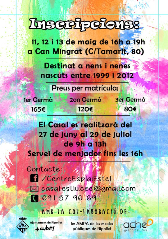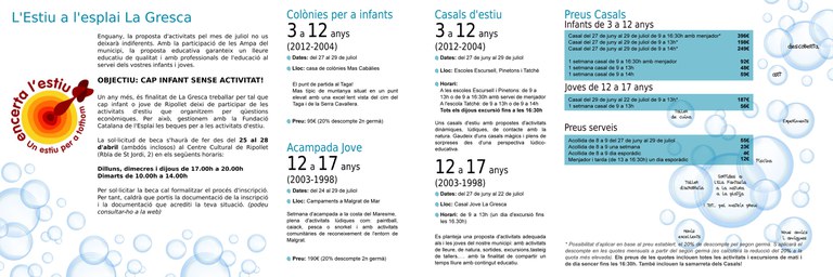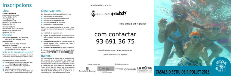 S'acaba el temps per inscriure's als Casals d'Estiu dels esplais La Gresca i L'Estel. Aquest divendres, 13 de maig, La Gresca encara estarà al Casal de Joves (rbla. de Sant Jordi, 6), de 17 a 20 hores, per realitzar les inscripcions. Per la seva banda, L'Estel estarà també aquest divendres a la seu de l'entitat, a la Torre Can Mingrat (carrer de Tamarit, 80), de 16 a 19 hores.