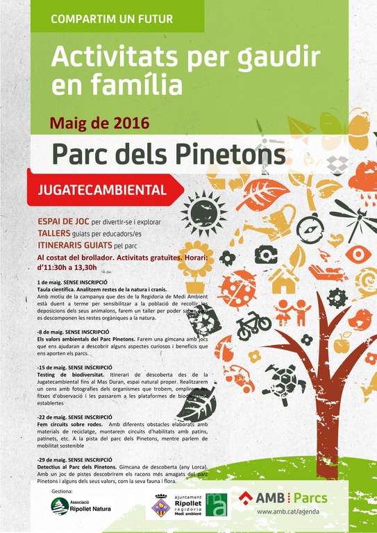 El brollador del parc dels Pinetons acull aquest diumenge, 15 de maig, a partir de les 11.30 hores, una nova sessió de la Jugatecambiental. En aquesta ocasió, l'activitat porta el títol de Testing de biodiversitat. Es tracta d'un itinerari de descoberta des de la Jugateca fins a l'espai natural de Mas Duran, en el qual els participants faran un cens amb fotografies dels organismes que es trobin pel recorregut. L'activitat és gratuïta i no requereix inscripció prèvia.