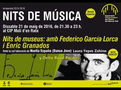 A dos quarts de deu de la nit, l'Associació d'Espectadors del Teatre del Mercat Vell, de la mà d'Àngel Esteve i Rafael López, organitzarà una sessió especial de Nits de Música. Sota el títol Nit de Museus amb Federico García Lorca i Enric Granados, es recitaran i ballaran poemes i cançons de l'autor. A més, en aquesta parlarà també dels aniversaris de Ramón Llull, Cervantes i Shakespeare. Col·laboraran en l'acte Noelia España, de Dansa Jove; Esther, profesora de guitarra del Centre Cultural i la rapsoda Laura Yepes.