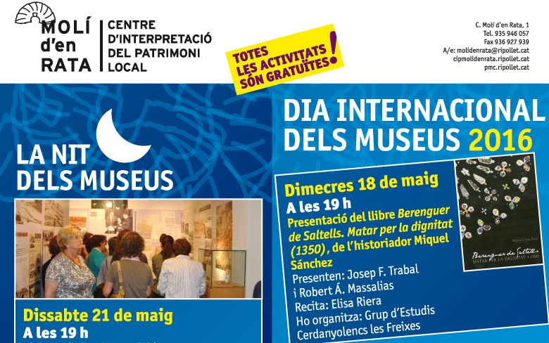 Ripollet celebra diumenge, 22 de maig, el Dia Internacional dels Museus amb una jornada de portes obertes al Centre d'Interpretació del Patrimoni Molí d'en Rata. Les instal·lacions d'aquest equipament es podran visitar entre les deu del matí i les dues de la tarda. A més, a dos quarts d'onze del matí i a les dotze del migdia s'hi organitzaran sengles visites teatralitzades.