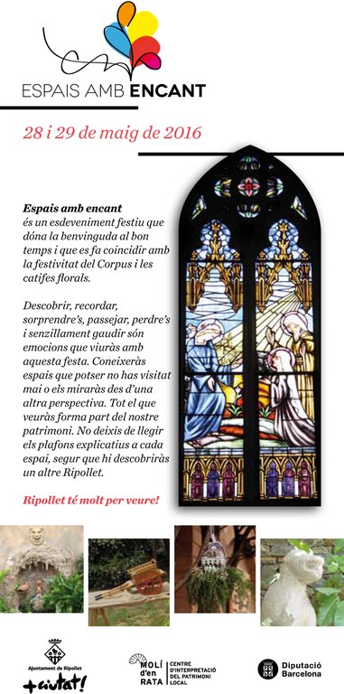 Des de la Regidoria de Patrimoni i Memòria Històrica conviden els ripolletencs i les ripolletenques a participar en aquesta edició dels Espais amb Encant i compartir les imatges que prenguin a les xarxes socials amb l'etiqueta #Ripolletencant16.