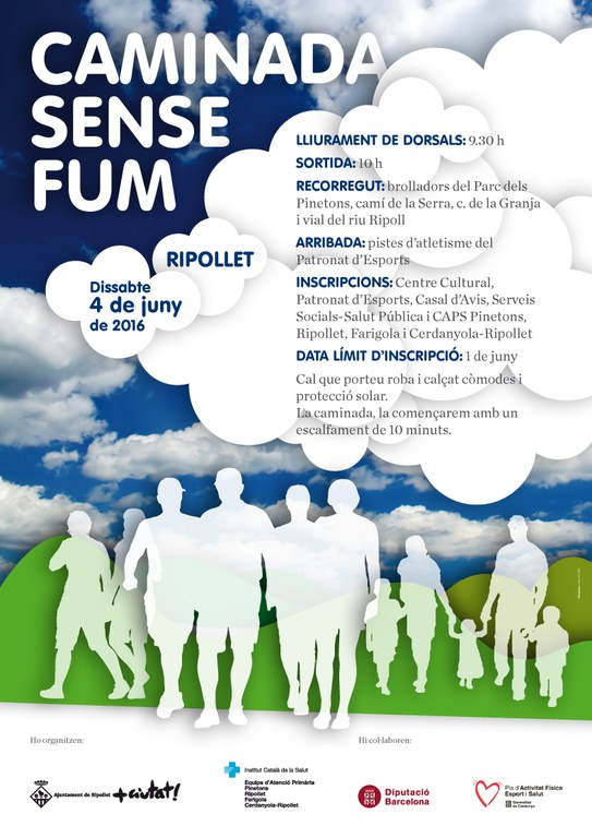 Aquest dissabte, 4 de juny, se celebra la 3a edició de la Caminada sense fum, un esdeveniment organitzat per les regidories de Salut Pública i Esports, juntament amb els centres d'atenció primària de Ripollet. Amb aquesta activitat, Ripollet commemora el Dia Mundial sense Fum que se celebra el dia 31 de maig. La caminada té per objectiu conscienciar sobre la importància de l'adquisició d'hàbits saludables, la promoció de la salut i la potenciació de la pràctica esportiva.