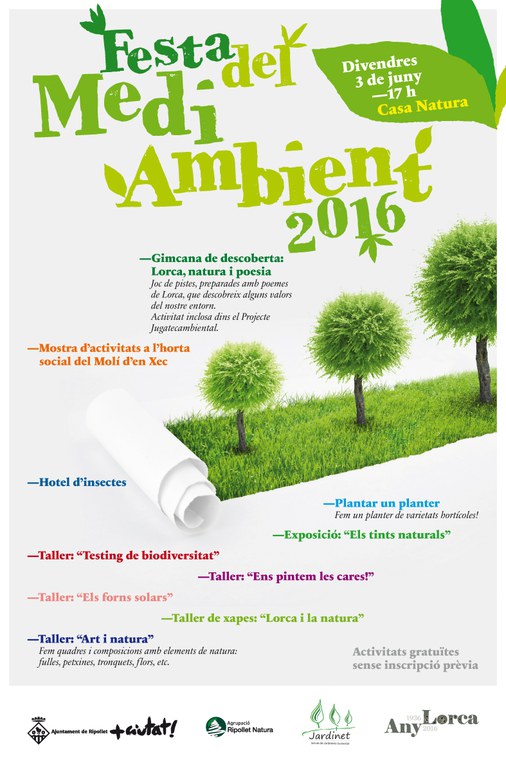 La Casa Natura celebra avui, 3 de juny, la Festa del Medi Ambient. L'acte està oberta a tot el públic i, a banda de commemorar el Dia Mundial del Medi Ambient, clou el programa d'activitats del curs escolar. La festa començarà a les cinc de la tarda sota les moreres del jardí amb diverses activitats relacionades amb l'Any Lorca. Així doncs, enguany el fil conductor de les activitats seran diferents poesies del poeta granadí que tenen a veure amb la natura.