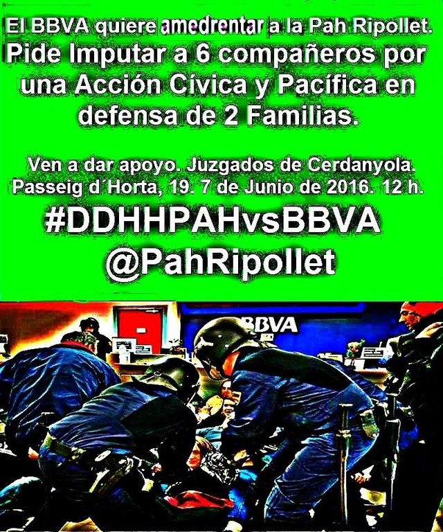 L'entitat social afegeix que el BBVA, "fent ús de la Llei mordassa, ha encausat una setantena de membres de la PAH a tot Catalunya". De fet, el 30 de juny, una altra veïna ripolletenca haurà d'anar als jutjats de Barcelona per un fet similar ocorregut al barri de Gràcia.