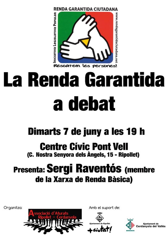 El Centre Cívic del Pont Vell acull aquest dimarts, 7 de juny, un debat sobre la Renda Garantida Ciutadana. L'acte, organitzat per l'Associació d'Aturats de Ripollet-Cerdanyola amb el suport dels consistoris de Ripollet i Cerdanyola, començarà a les 19 hores. El debat té l'objectiu de divulgar i estendre aquesta reivindicació. Sergi Raventós, membre de la Xarxa de Renda Bàsica, serà l'encarregat de moderar el debat.