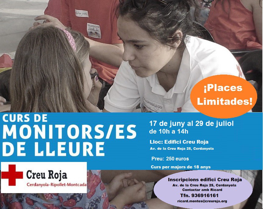 Dijous, 9 de juny, finalitza el període d'inscripció al curs de Monitor d'Activitats de Lleure Infantil i Juvenil que la Creu Roja de Cerdanyola-Ripollet-Montcada impartirà del 17 de juny al 26 de juliol. Es tracta d'un curs de 310 hores, per a majors de 18 anys. El curs es divideix en 150 hores lectives i unes altres 160 hores de pràctiques. Aquest curs s'equipara a la certificació professional, amb el qual s'obté el diploma i carnet de monitor. El curs es durà a terme de dilluns a divendres, de nou del matí a dues de la tarda. El preu és de 250 euros. Per a aturats i socis, el preu és de 225 euros. Per a més informació, adreçar-se al 93 691 61 61 o al correu electrònic ricard.montes@creuroja.org.