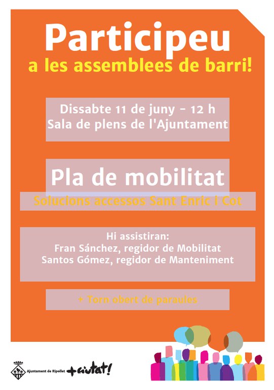 És previst que hi assisteixin Fran Sánchez i Santos Gómez, regidors de Mobilitat i de Manteniment, respectivament. Després de les intervencions dels dos regidors hi haurà torn obert de paraules.