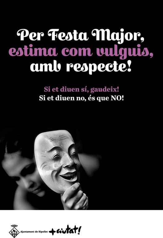 Per Festa Major, estima com vulguis, amb respecte! Aquest és el missatge que l'Ajuntament de Ripollet està difonent a través de les seves xarxes socials. El consistori vol una Festa Major per gaudir-la, lliure de violència sexista. Es tracta d'una campanya iniciada la passada edició de la Festa Major. Enguany, a més, l'Ajuntament també vol incidir en la necessitat de beure amb moderació durant la festa gran de Ripollet, sota l'eslògan 'La millor Festa Major és la que pots explicar'.