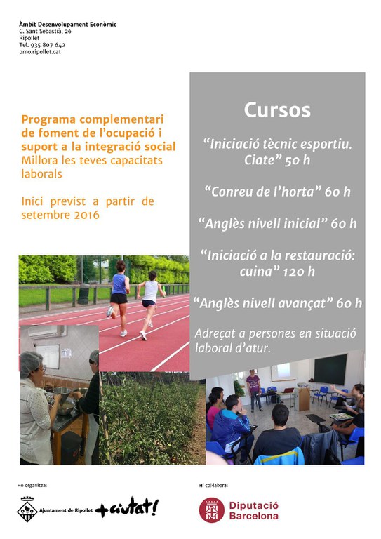 Es preveu que aquest programa de cursos s'iniciï a partir d'aquest mes de setembre. Estan organitzats per l'Ajuntament de Ripollet amb la col·laboració de la Diputació de Barcelona. Per a més informació, els interessats poden adreçar-se al Patronat d'Ocupació, al carrer de Sant Sebastià, número 26, o al telèfon 93 580 76 42.