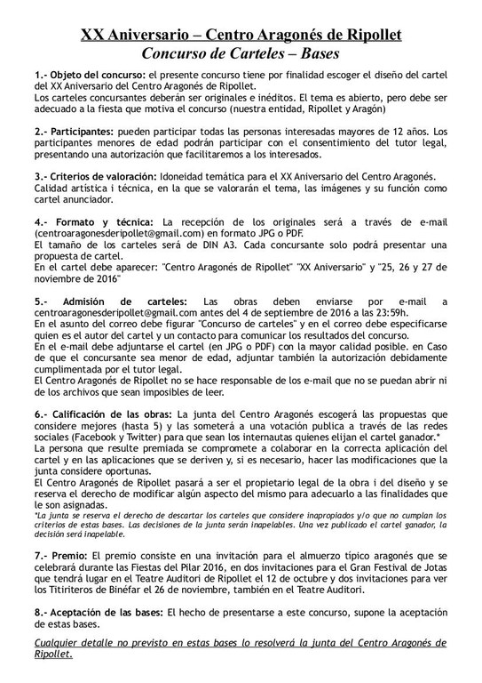 El concurs està adreçat a qualsevol persona major de 12 anys (si s'és menor, s'ha de presentar una autorització del seu tutor). La temàtica del cartell ha d'incloure elements relacionats amb Aragó, Ripollet i el mateix Centro Aragonés. A més, ha d'incloure les frases "Centro Aragonés de Ripollet", "XX aniversario" i "25, 26 y 27 de noviembre de 2016". El disseny s'ha d'enviar en format jpg o pdf, i el guanyador s'escollirà a través d'una votació popular al Facebook i Twitter de l'entitat.
