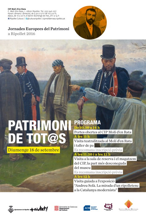 El Centre d'Interpretació del Patrimoni Molí d'en Rata participarà, un any més, a les Jornades Europees del Patrimoni que se celebraran diumenge, 18 de setembre. Sota el lema 'Patrimoni de tot@s', el CIP organitzarà diverses activitats que faran palès un treball en el qual s'hi han implicat diversos agents.