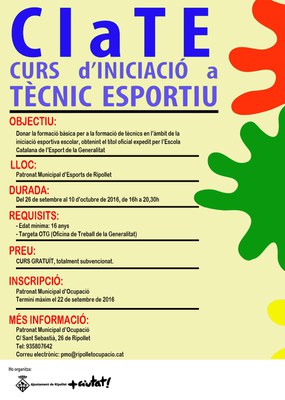 El Patronat Municipal d'Ocupació (PMO) realitza durant aquesta setmana les inscripcions per a un curs d'iniciació a tècnic esportiu. El termini per inscriure's acaba aquest dijous, 22 de setembre, i les sol·licituts s'han de lliurar a les oficines del PMO. Es tracta d'un curs gratuit, que s'impartirà entre el 26 de setembre i el 10 d'octubre en horari de tarda a les instal·lacions del poliesportiu.