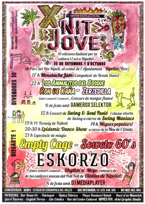 Avui divendres, 30 de setembre, comença la desena edició de la Nit Jove que organitza el Centre d'Esplai l'Estel. L'activitat, que s'allargarà també al dissabte, 1 d'octubre, tindrà com a escenari el parc del Riu Ripoll. Aquest any hi haurà concerts de grups prou coneguts com Eskorzo o Soweto, a més de l'actuació de formacions locals com els Animalitos del Bosque, Ron de Caña i Zerzedilla. També hi haurà classes de swing, una competició de breakdance i es recupera el concurs de menjar flam. En la secció de l'Agenda es troba la programació completa.