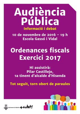 Aquest dijous, 10 de novembre, l'Escola Gassó i Vidal acollirà una nova Audiència Pública dedicada a les Ordenances Fiscals de l'any 2017. La trobada començarà a les 19 hores. La regidora Pilar Castillejo, 1a tinent d'alcalde d'Hisenda, explicarà els punts més destacats de les Ordenances i resoldrà els dubtes dels assistents. L'acte serà obert a tothom i, després de les explicacions de la regidora, s'obrirà un torn obert de paraula.