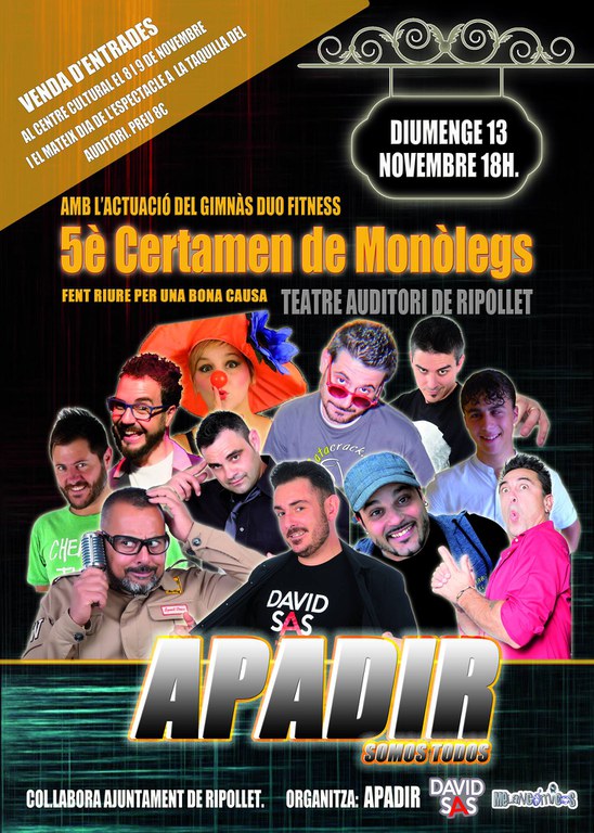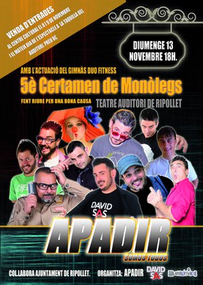 Apadir celebrarà el dia 13 el cinquè Certamen de Monòlegs. L'acte tindrà lloc a les 18 hores al Teatre Auditori del Mercat Vell. Serà presentat per l'humorista David Sas i compta amb la participació de l'agrupació de monologuistes Melancómicos i la col·laboració de l'Ajuntament de Ripollet. També hi actuarà el Gimnàs Dúo Fitness. El preu de l'entrada és de 8 euros.