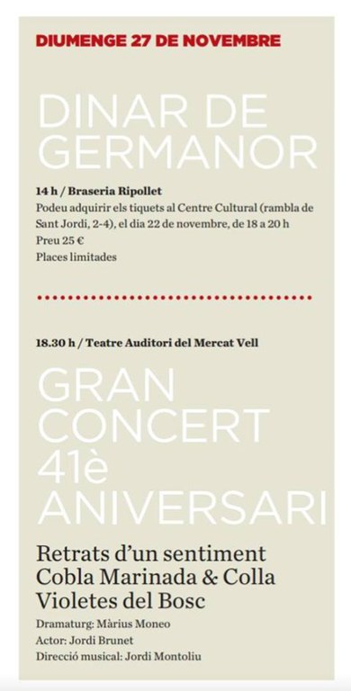 L'entitat Ripollet Sardanista celebra enguany 41 anys d'existència. I ho celebrarà amb un gran concert que oferirà aquest diumenge, 27 de novembre, a la tarda. A partir de les 18.30 hores, el Teatre Auditori del Mercat Vell acollirà el gran concert amb la representació de l'espectacle Retrats d'un sentiment, que anirà a càrrec de la Cobla Marinada i la Colla Violetes del Bosc. El concert es completa amb les actuacions de la Cobla La Principal del Llobregat i la Cobla Sant Jordi Ciutat de Barcelona, que oferiran un ampli repertori.