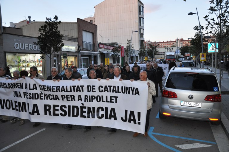 Al voltant d'un centenar de persones van participar en la manifestació convocada pel Club de Jubilats i Pensionistes de Ripollet dijous, 24 de novembre, a la tarda. Els manifestants van sortir des de la rambla de Sant Esteve i van finalitzar davant l'Ajuntament, on van llegir un manifest per demanar accions polítiques que facin realitat la residència.