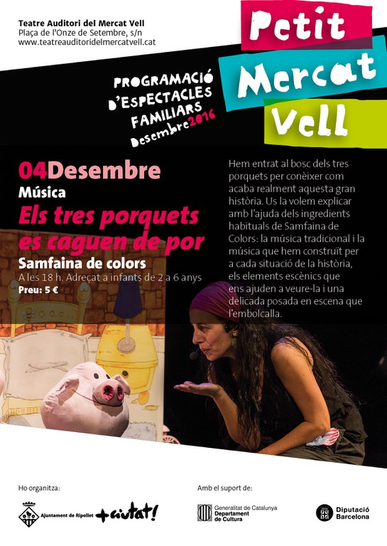 Els tres porquets es caguen de por és el títol del nou espectacle familiar del cicle Petit Mercat Vell. L'espectacle, una divertida obra musical adreçada a infants de 2 a 6 anys, es podrà veure el 4 de desembre al Teatre Auditori del Mercat Vell a partir de les sis de la tarda. L'espectacle anirà a càrrec de la companyia Samfaina de Colors, creadora de més d'una vintena d'espectacles i ha realitzat prop de 5.000 representacions i més d'un milió i mig de persones han vist les seves obres.