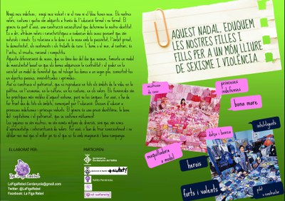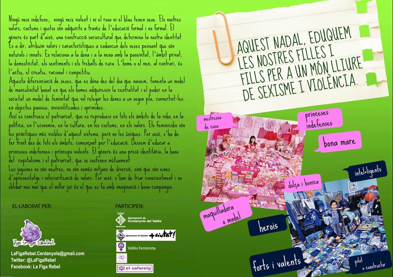 La Regidoria de Polítiques de Gènere i Feminismes torna a posar en marxa la campanya sobre joguines no sexistes. La campanya, que compta amb la col·laboració amb la Regidoria d'Educació i amb la participació de l'Ajuntament de Cerdanyola del Vallès i d'entitats feministes de la comarca, ofereix un decàleg de recomanacions a tenir en compte a l'hora d'escollir una joguina.