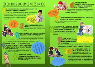 El decàleg s'ha fet arribar a tot l'alumnat dels centres educatius d'infantil i primària, de forma que les famílies triïn de forma conscient les millors joguines per als seus fills i filles. Igualment, es recorda que la joguina és una eina d'aprenentatge i interiorització de valors i escollir-la bé servirà per educar els infants en un món lliure de sexisme i violència.