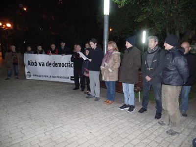 Tal com s'havia convocat arreu de Catalunya, a les 8 del vespre més d'una cinquantena de persones s'han concentrat aquest dimarts, 27 de desembre, davant l'Ajuntament per tal d'expressar el seu suport i solidaritat a Joan Coma. El regidor de la CUP a l'Ajuntament de Vic havia estat detingut al matí per un presumpte delicte de sedició. La concentració ha estat encapçalada per representants de Decidim Ripollet, ERC-JpR, PDECAT i l'ANC. El mateix alcalde, Jose M. Osuna, ha llegit el manifest redactat per la plataforma Moviment 30/03 en suport al regidor de la CUP, sota el títol 'El futur del nostre poble no el decidirà cap tribunal: ni un pas enrere'.