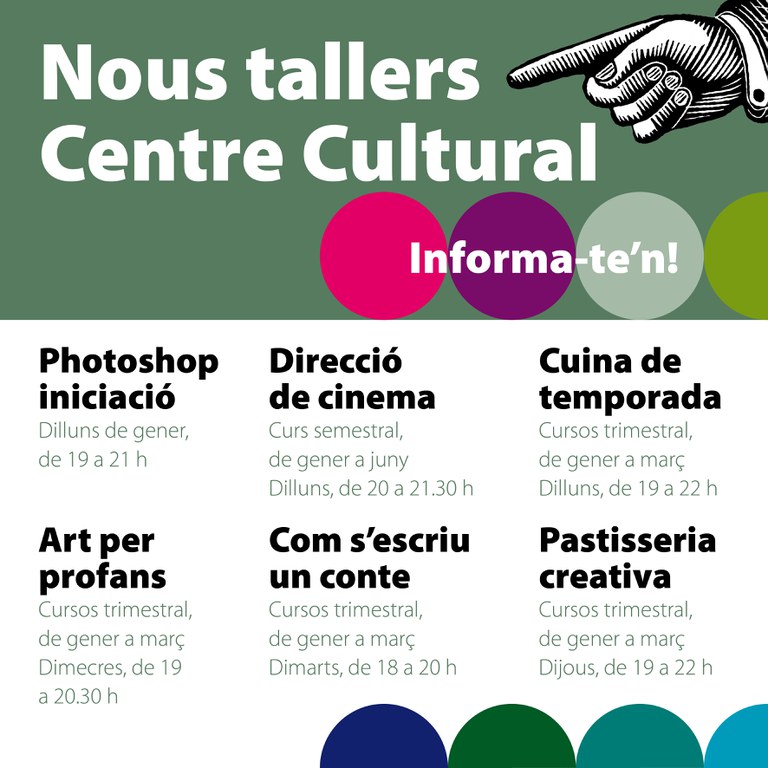 En aquests moments tots els tallers encara tenen places lliures. Per a més informació, cal adreçar-se al Centre Cultural.