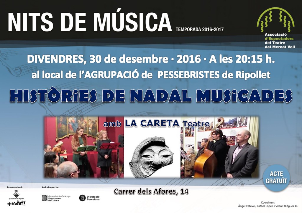 Aquest divendres, 30 de desembre, les Nits de Música celebren una nova edició molt especial. Com és tradició per aquestes dates, les Nits es traslladen al local de l'Agrupació de Pessebristes de Ripollet (c. dels Afores, 14). Amb la col·laboració de l'entitat La Careta Teatre, oferiran la sessió 'Històries de Nadal musicades'. La cita començarà a les 20.15 hores.