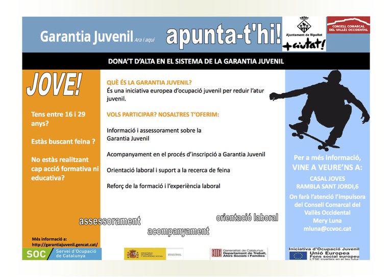 El pròxim dilluns, 6 de febrer, a les 13 h, es farà al Centre Cultural una nova xerrada sobre la Garantia Juvenil, una iniciativa europea per reduir l'atur entre els joves de 16 a 29 anys que no treballen ni estudien. Aquesta xerrada està organitzada per la regidoria de joventut, el Patronat Municipal d'Ocupació i el Consell Comarcal del Vallès Occidental. A més, a partir d'ara, els joves podran informar-se o inscriure's en aquest programa a través d'un nou servei d'assessorament quinzenal, que es durà a terme els dilluns al matí al Casal de Joves (rbla. de Sant Jordi, 6).