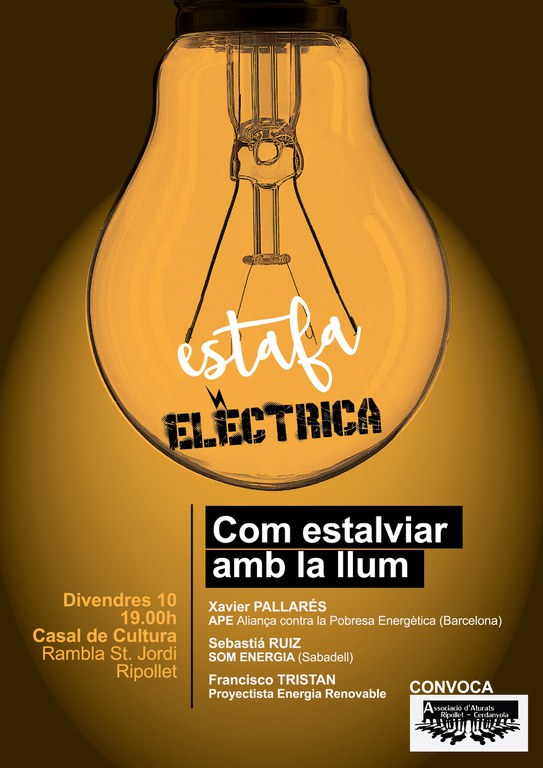 L'Associació d'Aturats Ripollet-Cerdanyola organitza aquest divendres, 10 de febrer, un debat sobre les tarifes elèctriques i l'abús en l'import de les factures. Sota el títol Com estalviar amb la llum, el col·loqui debatrà el paper dels usuaris i de les grans companyies. També reflexionarà sobre quines són les fonts d'energia alternatives, que poden generar llocs de treball i, alhora, rebaixar la despesa familiar. El debat comptarà amb la presència de Xavier Pallarès, de l'Aliança contra la Pobresa Energètica; Sebastià Ruiz, de Som Energia, i Francisco Tristán, projectista d'energies renovables.