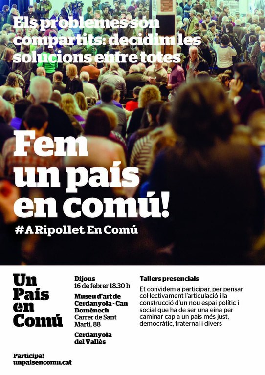 Diferents forces polítiques, com Podem Ripollet i Cerdanyola, EUiA i Iniciativa per Catalunya, celebraran aquest dijous, 16 de febrer, un procés participatiu per recollir idees i demandes dels seus afiliats i simpatitzants. L'acte tindrà lloc al Museu d'Art de Cerdanyola a partir de dos quarts de set de la tarda. Sota el lema 'Un país en comú', aquestes forces conviden tothom a participar en la jornada per convertir els partits "en el referent del canvi progressista, radicalment democràtic, plurinacional, transversal i catalanista popular a Catalunya".