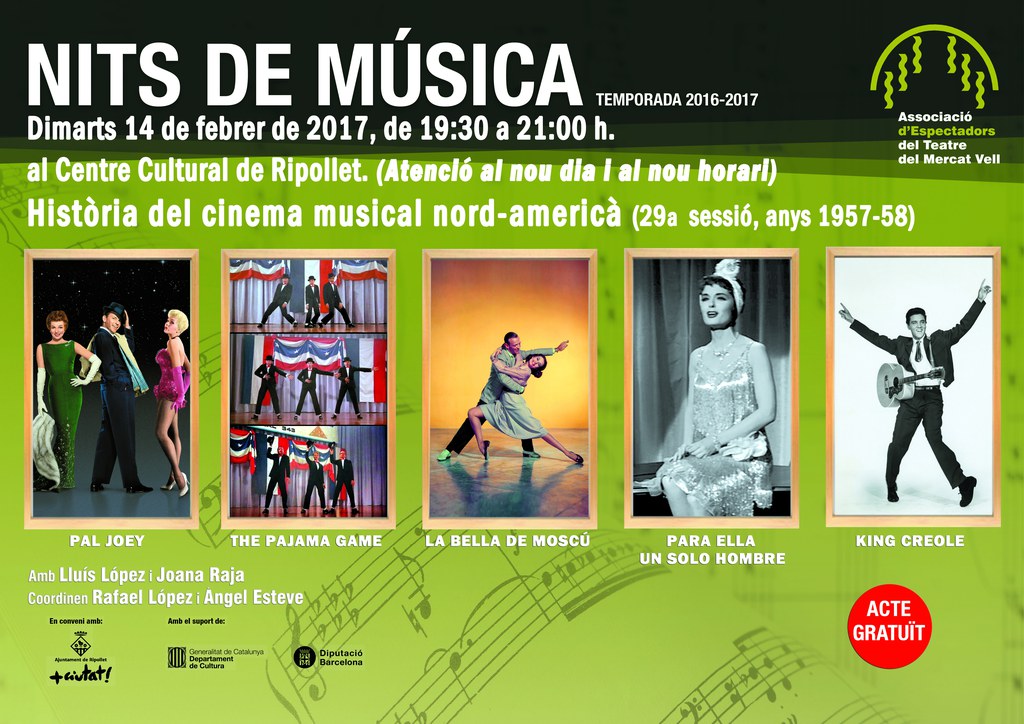 La història del cinema musical nord-americà tornarà a ser l'eix de la sessió de Nits de Música que tindrà lloc aquest dimarts, 14 de febrer. De 19.30 a 21 hores, la trobada centrarà la seva atenció en el període comprés entre els anys 1957-1958. Aquesta 29a edició dedicada al cinema musical nord-americà anirà a càrrec de Joana Raja i Lluís López. Els dos ponents parlaran de les pel·lícules Pal Joey, The pajama game, La bella de Moscú, Para ella un solo hombre i King Creole. Com sempre, l'entrada a les Nits de Música és lliure.