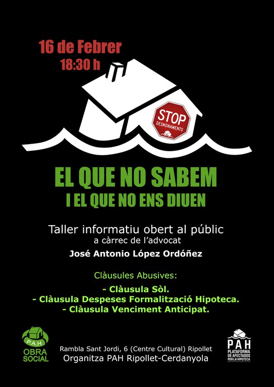 La Plataforma d'Afectats per la Hipoteca (PAH) de Ripollet i Cerdanyola ha organitzat per a aquest dijous, 16 de febrer, una xerrada sobre les clàusules hipotecàries. L'acte tindrà lloc al Centre Cultural a partir de les 18.30 hores i anirà a càrrec de l'advocat sabadellenc José Antonio López Ordoñez.