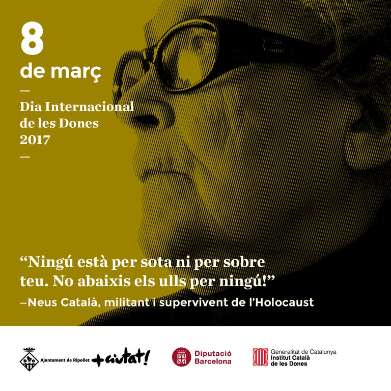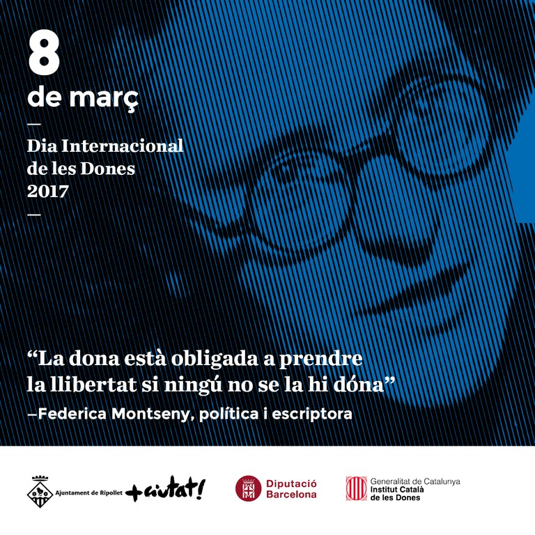 Com no pot ser d'altra forma, la dona protagonitza totes aquestes activitats de la programació del Dia Internacional de les Dones des de diferents òptiques: lluitant per la igualtat, contra els tòpics i estereotips, a favor de la diversitat i dones fent història. Enguany, també la imatge d'aquesta diada commemorativa ha volgut ser reivindicativa. Les encarregades de recordar-nos que s'ha de continuar lluitant per la igualtat són Montserrat Roig, Neus Català, Federica Montseny i Teresa Claramunt. Tots els actes estan oberts al públic en general i no cal inscripció prèvia, llevat del sopar-debat del dia 11 de març que requereix reserva.