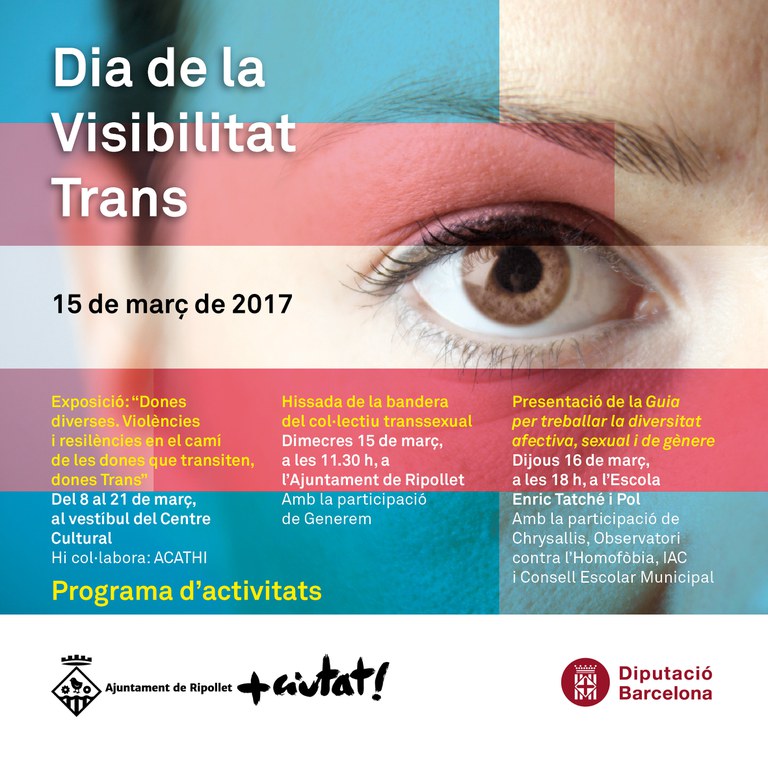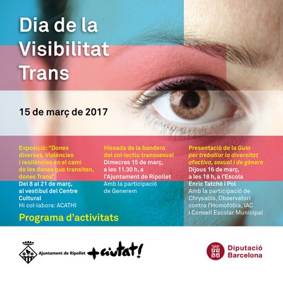 Dimecres, 15 de març, es commemora el Dia de la Visibilitat Trans. A Ripollet, la Regidoria de Polítiques LGTBI ha preparat tres activitats, amb la col·laboració de diverses entitats que treballen contra la homofòbia i la integració d'homosexuals, bisexuals i transsexuals. Entre ells destaca la presentació de la Guia per treballar la diversitat afectiva, sexual i de gènere. L'acte tindrà lloc a l'escola Enric Tathé, dijous 16 de març, a les 18 h i comptarà amb la participació de l'entitat Chrysallis, l'Observatori contra l'Homofòbia, la IAC i el Consell Escolar Municipal.