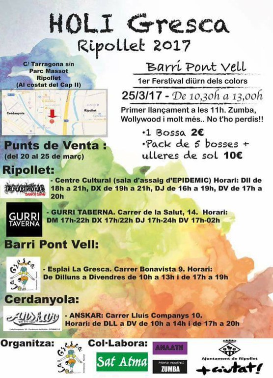 El barri del Pont Vell acull aquest proper dissabte, 25 de març, el primer festival Holi diürn a Ripollet. Aquest primer Festival diürn dels colors tindrà lloc al carrer de Tarragona, al parc de Massot, al costat del CAP II, entre les 10.30 i les 13 hores. Aquesta festa Holi està organitzada pel Centre d'Espai de La Gresca. El primer llançament es farà a les 11 hores i els assistents podran gaudir de zumba i dansa Bollywood, entre altres activitats.
