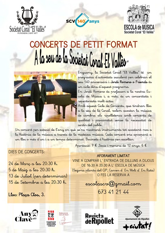 El cicle de Concerts de petit format constarà de quatre concerts, un per cadascuna de les estacions de l'any. Amb aquests concerts, la Societat Coral "El Vallès" i el conjunt Jordi Romero & friends volen acostar la música de cambra als ripolletencs amb concerts de qualitat i proximitat. La resta de concerts en petit format tindran lloc el 5 de maig, el 13 de juliol i el 15 de setembre, a les 20.30 h, a la seu de l'entitat. El preu de l'entrada serà de 9 euros per al públic en general, i de 6 euros per als socis de l'entitat i per als menors de 12 anys. Les entrades es poden adquirir a l'Escola de Música, de dilluns a dijous, de les 16.30 a les 20.30 hores. Com que l'aforament és limitat, també es poden reservar places al correu escolascv@gmail.com.