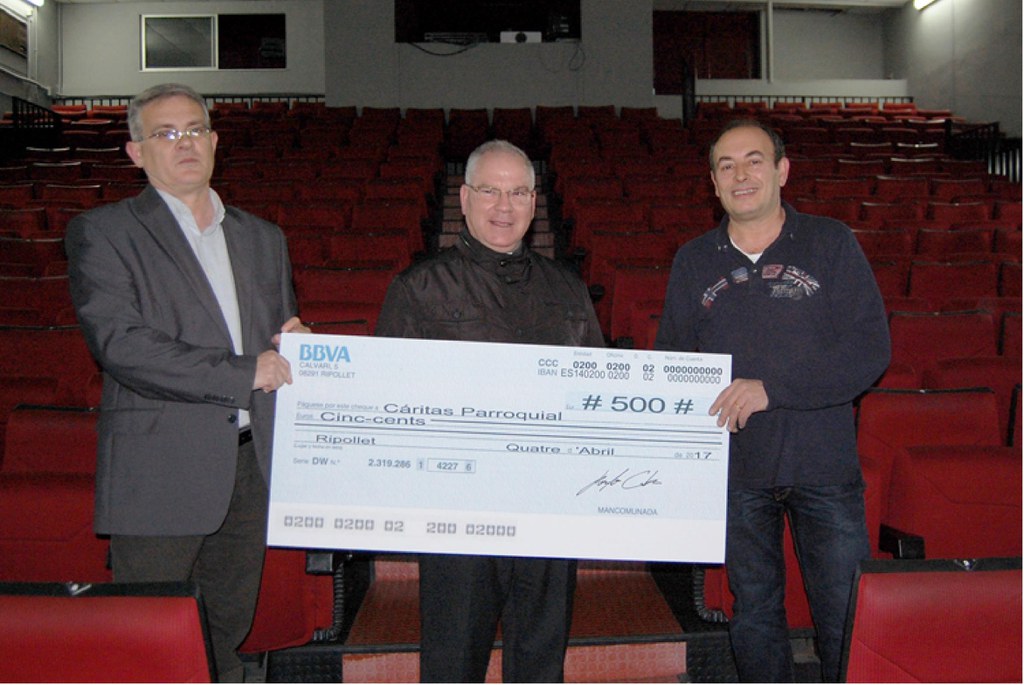 El passat 4 d'abril, els Amics del Teatre de Ripollet van fer entrega a Càritas d'un xec per valor de 500 euros. L'acte d'entrega es va realitzar al Centre Parroquial. En un comunicat de premsa, l'entitat d'Amics del Teatre assegurava: "Com a entitat del poble, ens fa molta il·lusió col·laborar amb el nostre poble; oferint teatre, emocions, alegries, comèdies, musicals, tragèdies... Si, a més, podem aportar el nostre granet de sorra per la gent necessitada del poble, doncs millor que millor".