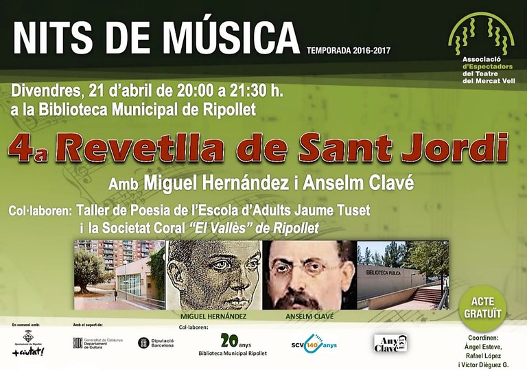 A les vuit del vespre, a la Biblioteca Municipal, tindrà lloc la 4a Revetlla de Sant Jordi, on el taller de Poesia de l'escola d'adults Jaume Tuset i la Societat Coral "El Vallès" realitzaran un homenatge a Miguel Hernández i a Anselm Clavé, un acte emmarcat també en l'Any Clavé.
