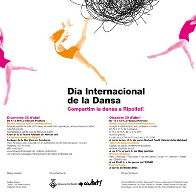 Aquest cap de setmana se celebra el Dia Internacional de la Dansa, i Ripollet s'hi adhereix per segon any. L'any passat, la celebració ja va suposar un gran èxit tant de participació, com de treball i esforç conjunt entre les entitats, col·lectius i gimnasos locals. Amb l'expectativa de fer créixer aquesta participació, enguany s'ha ampliat el programa d'activitats, incloent un dia més de celebració, i més activitats formatives. En aquesta edició, a més, s'ha superat el nombre d'entitats implicades en l'acte. Si l'any passat sortien al carrer deu associacions i gimnasos, aquest any en són un total de 13.