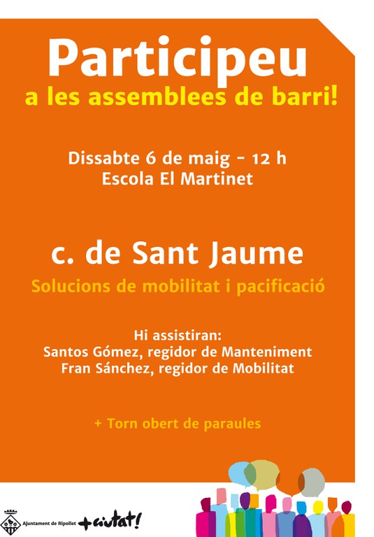 La Regidoria de Mobilitat i Transport Públic, juntament amb la de Manteniment, ha convocat una nova assemblea de barri que girarà entorn de les possibles solucions de mobilitat al carrer de Sant Jaume. Aquesta assemblea de barri tindrà lloc aquest dissabte, 6 de maig, a les 12 hores, a l'escola El Martinet. Els regidors Fran Sánchez i Santos Gómez plantejaran als assistents possibles solucions de mobilitat i pacificació al carrer de Sant Jaume.