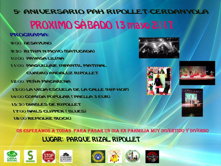 Aquest pròxim dissabte, 13 de maig, la Plataforma d'Afectats per la Hipoteca Ripollet-Cerdanyola celebra el seu 5è aniversari amb una festa que s'allargarà tot el dia. El lloc escollit per a la cita és el parc Rizal, on està ubicada des del febrer del 2016, la seva seu social.