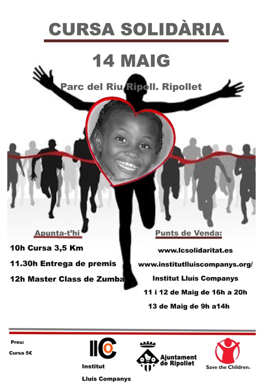 L'Institut Lluís Companys, amb la col·laboració de l'Ajuntament de Ripollet, ha organitzat una jornada solidària per recaptar fons per a l'ONG Save the Children. La jornada tindrà lloc el matí del 14 de maig al parc del Riu Ripoll i consistirà en una cursa, una classe magistral de zumba i tallers de treballs manuals, maquillatge i papiroflèxia, entre altres.