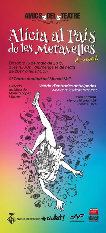 Aquest dissabte, 13 de maig, Amics del Teatre dóna el tret de sortida de la seva temporada d'espectacles. Ho farà amb un plat fort, un musical basat en el llibre Alícia al País de les Meravelles, de Lewis Carroll. Es tracta d'una obra musical dirigida per Mònica López i adaptada per Jordi Rodríguez. L'entitat ha preparat una gran sorpresa per als assistents a les sessions d'aquest cap de setmana. Ha editat un CD amb les cançons del musical. Així que tothom qui vulgui podrà adquirir aquest disc i gaudir de l'obra a casa seva.