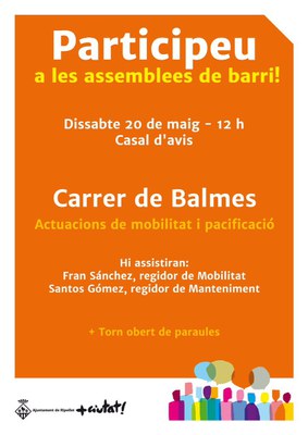 La Regidoria de Mobilitat i Transport Públic, juntament amb la de Manteniment, han convocat una nova assemblea de barri, que se celebrarà aquest pròxim dissabte, 20 de maig. La cita se celebrarà al Casal d'Avis, a partir de les 12 hores. La trobada girarà al voltant de la mobilitat al carrer de Balmes i les possibilitats de convivència del trànsit rodat i de vianants en aquest espai. A l'assemblea de barri hi assistiran els regidors Fran Sánchez i Santos Gómez.