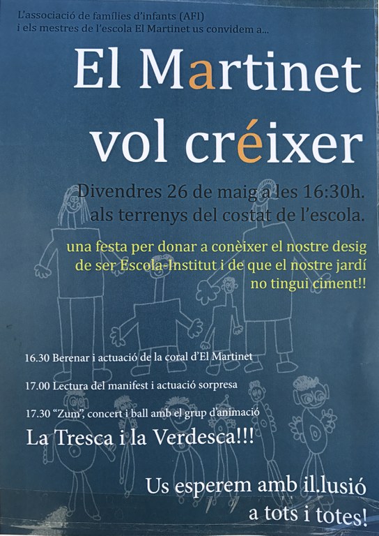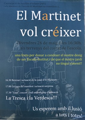 L'Associació de Famílies d'Infants (AFI) d'El Martinet de Ripollet i la direcció de l'escola han organitzat la primera festa "El Martinet vol créixer", amb l'objectiu de donar a conèixer la seva iniciativa de continuïtat del projecte educatiu del centre a través d'una Escola-institut. En aquests moments estan mantenint reunions amb diferents entitats de Can Mas i del poble, i amb el Govern Municipal i la resta de formacions polítiques, per tal d'explicar-los la seva proposta i asseguren que "està rebent molt bona acollida". Amb aquesta festa, El Martinet vol compartir amb tot Ripollet "la il·lusió i la força amb la que estem fent aquest camí". La festa tindrà lloc aquest divendres, 26 de maig, a partir de les 16.30 h, al voltant de l'escola.