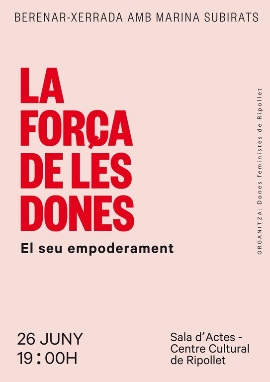Dones Feministes de Ripollet organitza el 26 de juny, a les 19 h, un berenar-xerrada amb la sociòloga i política Marina Subirats. L'acte, que tindrà lloc a la sala d'actes del Centre Cultural, porta per títol La força de les dones. L'activitat és fruit de la voluntat, expressada en el sopar del 8 de març, de debatre i reflexionar sobre el veritable paper social de les dones.