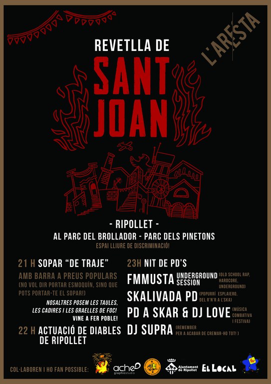 L'associació de joves L'Aresta ha organitzat una revetlla de Sant Joan "popular, no consumista i inclusiva", que tindrà lloc al brollador del parc dels Pinetons. La celebració, oberta a totes les edats i públics, es declara "espai lliure de discriminació". Segons van explicar a la presentació de l'activitat, és fruït de la tasca d'autogestió que duu a terme l'entitat, creada a principi d'aquest any amb l'objectiu de "fer poble" i el "treball horitzontal" amb altres col·lectius locals.