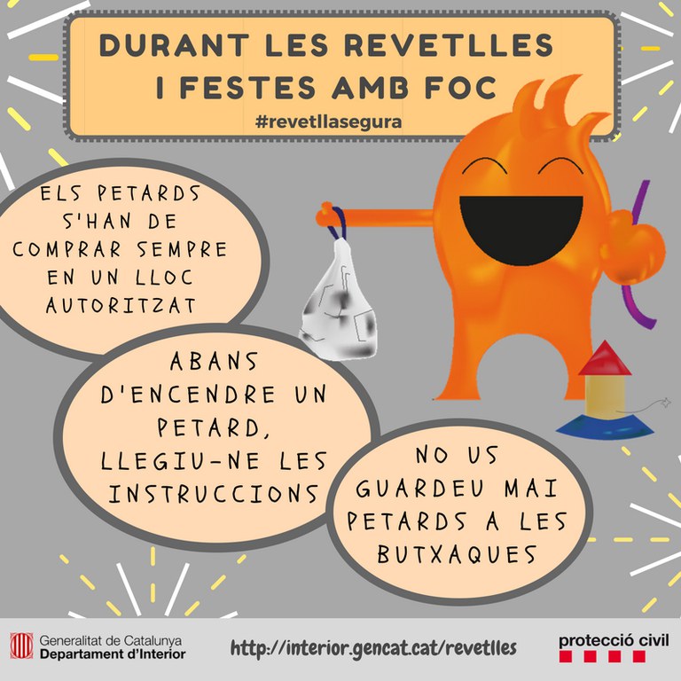 Respecte als petards i el seu ús, es recomana que es comprin en els establiments autoritzats. No s'ha de guardar cap article pirotècnic a les butxaques, i no es poden subjectar mentre s'encenen. És recomanable allunyar-los de la cara o qualsevol altre membre del cos. No s'han de llençar contra les persones, i si no exploten, val més no tocar-los sense haver-los remullat abans.