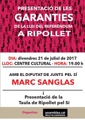 El diputat de Junts pel Sí Marc Sanglas serà el 21 de juliol a Ripollet per presentar les garanties a la Llei del Referèndum sobre la independència de Catalunya convocat per a l'1 d'octubre. Serà a les set de la tarda al Centre Cultural en un acte organitzat per Ripollet per la Independència.