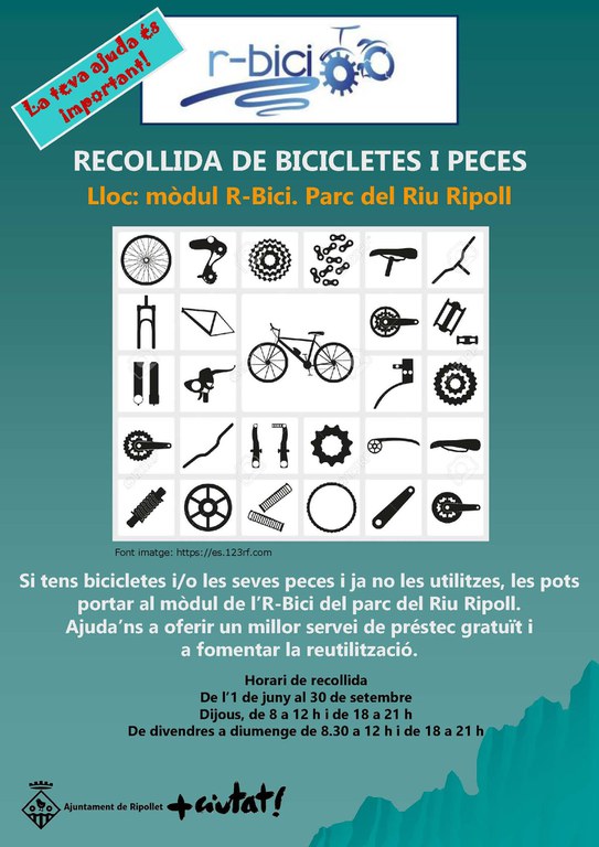 L'Ajuntament ha tornat a fer una crida a col·laborar amb el servei r-bici. Si el mes de juny es necessitaven bicicletes petites, ara demanen aportar bicicletes de tot tipus o peces que els veïns ja no utilitzin. L'objectiu és ajudar a oferir un millor servei de préstec gratuït i a fomentar la reutilització. Els interessats poden portar el material al mòdul de l'R-bici del parc del riu Ripoll. Recodem que el servei funciona fins el 30 de setembre, de dijous a divendres en horari de matí i tarda.